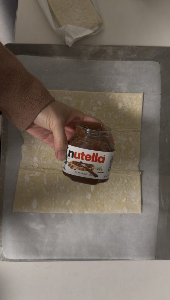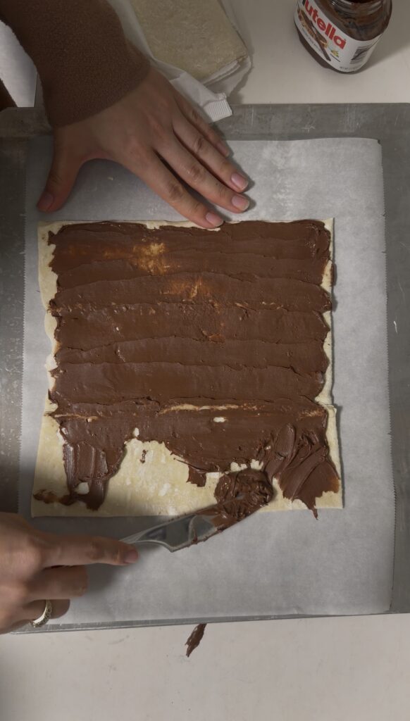 Spread a thin, even layer of Nutella over one puff pastry sheet.