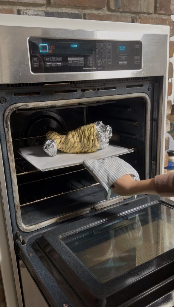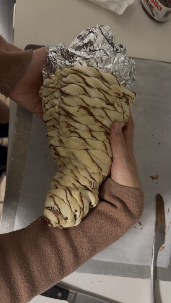 Shape foil into a hollow cornucopia form. Keep it packed as loosely as possible so it’s easier to remove later. Make sure the opening gradually widens so it resembles a real cornucopia, and it’s easier to pull out once finished baking.
