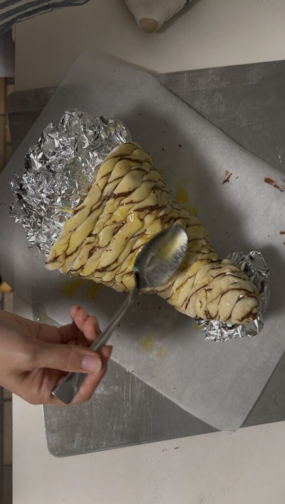 Brush the entire pastry lightly with melted butter. Use a pastry brush, not a spoon like I did (my kids stole my brush) because the drips pool at the base and can make it soggy.