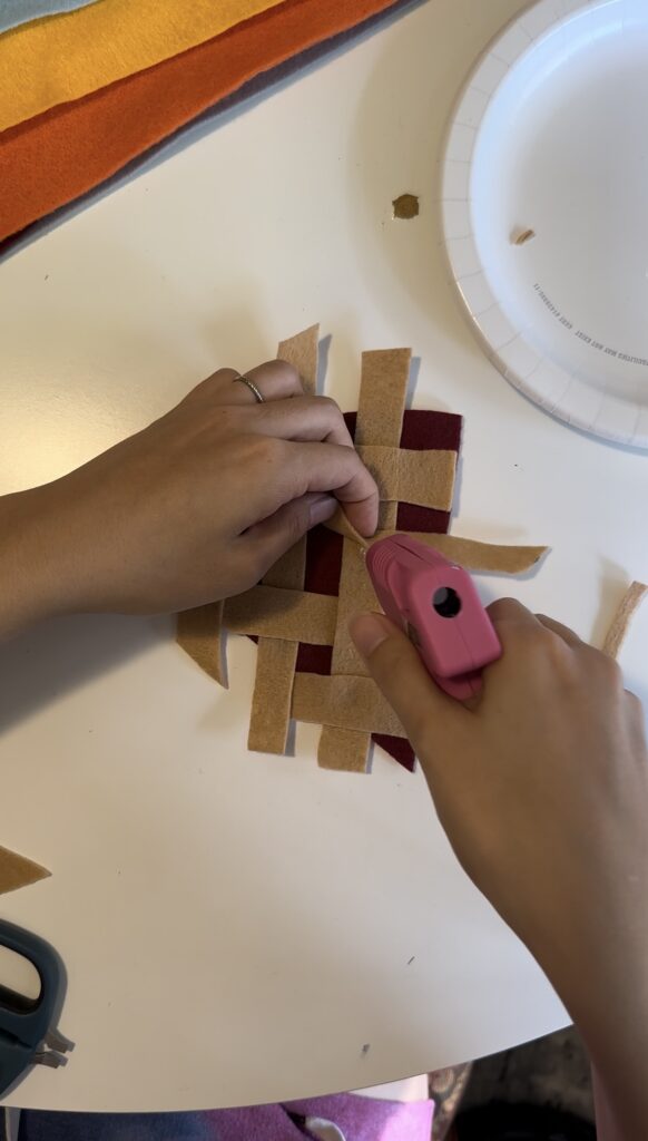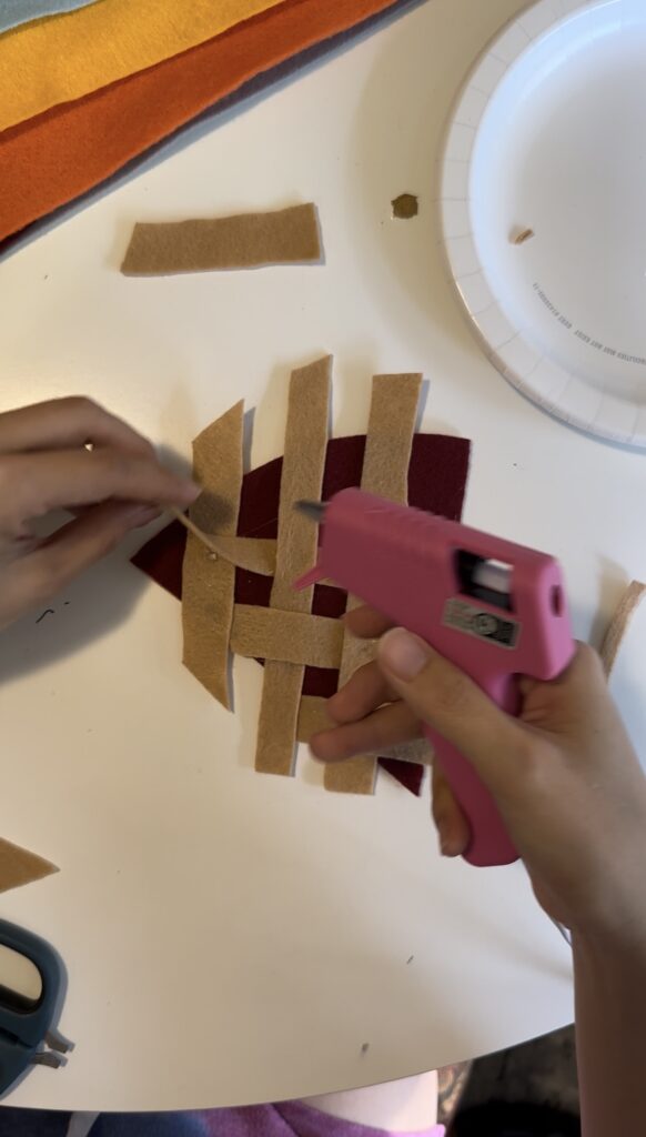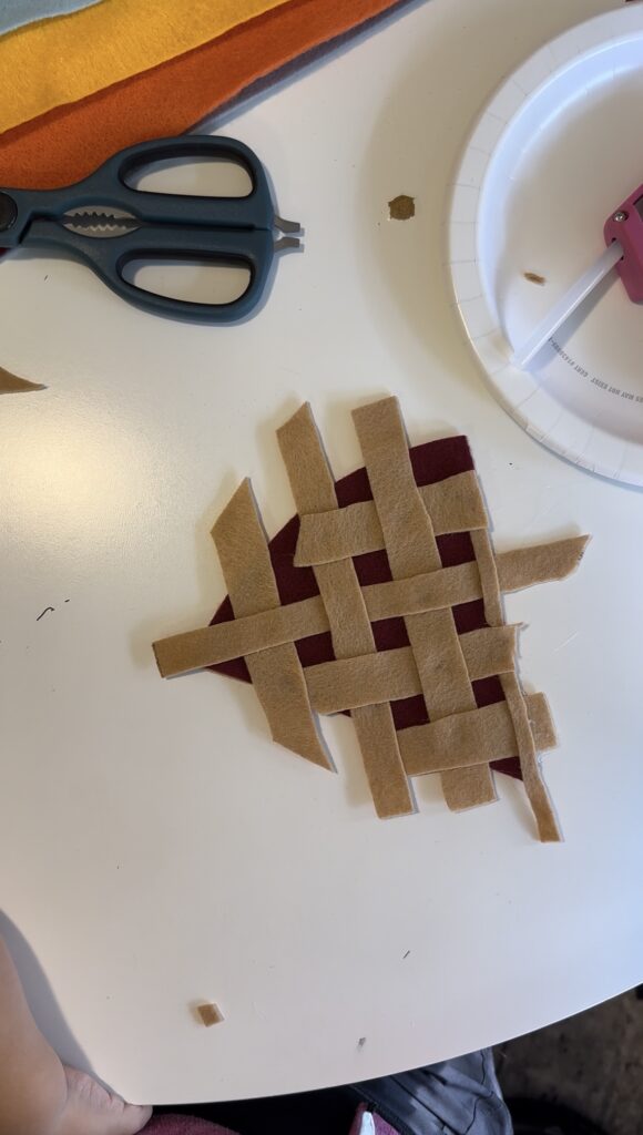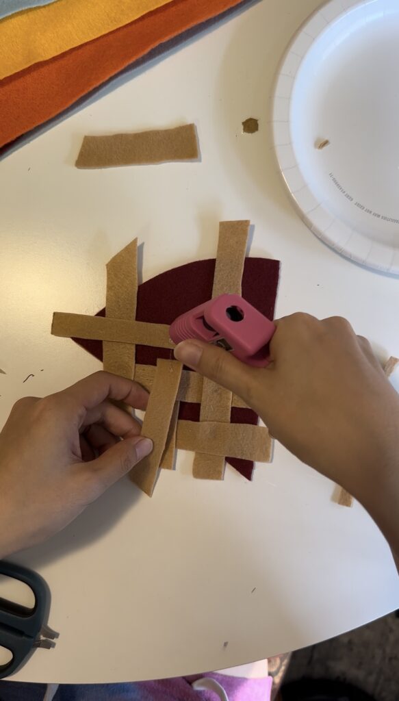 – Cut thin strips of **light brown felt** and weave them in a **basket pattern** over the red circle to create the lattice crust.