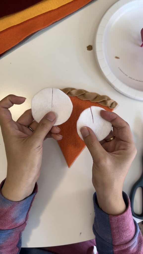 – To make the **whipped cream**, cut **two white felt circles** and make a small slit in each one.