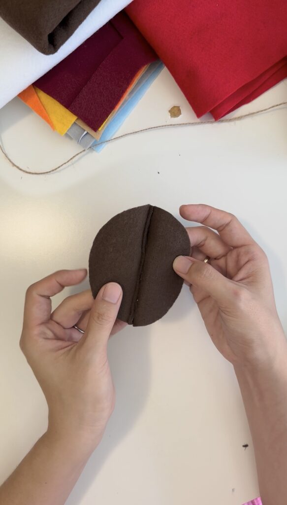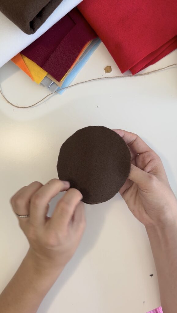 Cut two **dark brown felt circles** the same size as your peppermint design. Hot glue a **half-circle connector piece** of felt between them, creating a small gap at the top where the rope will go later.