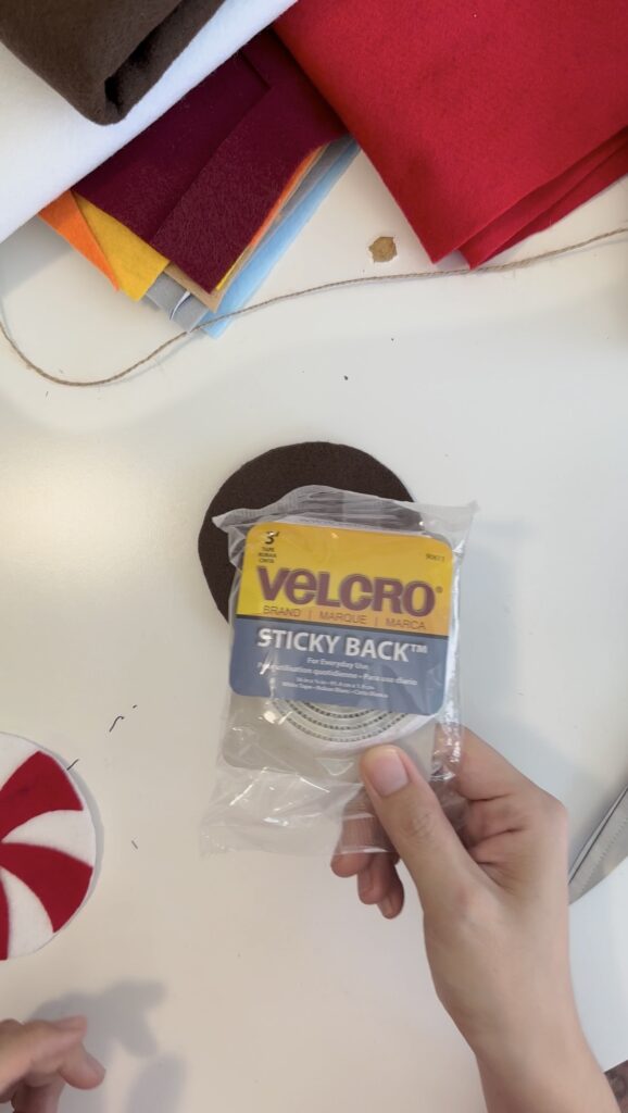 **Note:** When adding Velcro, think about gravity. If you attach it only at the top (where the rope runs), the hanging angle might cause the pies or peppermints to tilt slightly. To avoid this, you can glue the peppermints directly to the base instead of using Velcro. The peppermints hide easily behind the pies, so only the pies truly need to be detachable.