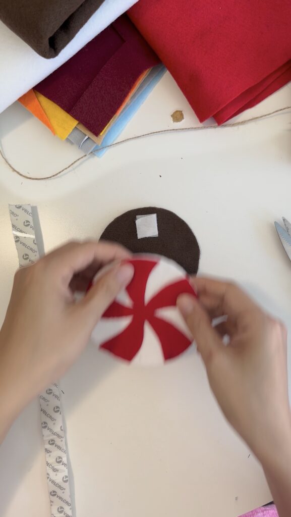 Flip the felt base over and repeat the same process for the **peppermint side** — attach Velcro, press the peppermint piece in place, and check alignment.
