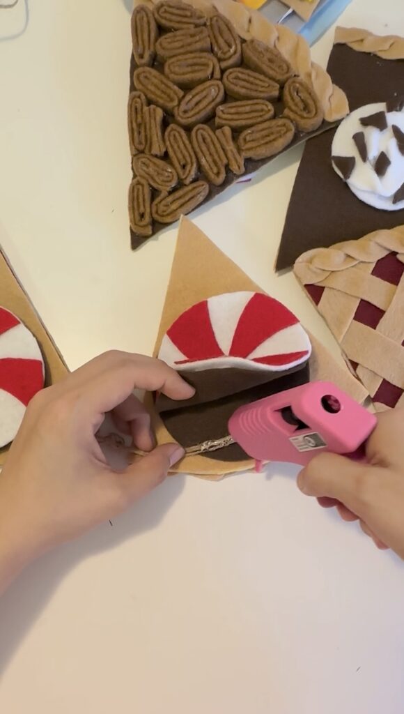 Now it’s time to build your garland! Place your main rope or cord between the two felt base circles (into the gap you left earlier) and **hot glue** it in place. Do this while the pies and peppermints are still attached — that way, you can easily space everything evenly. If you space based only on the dark brown bases, you might not leave enough room once the pies are added.