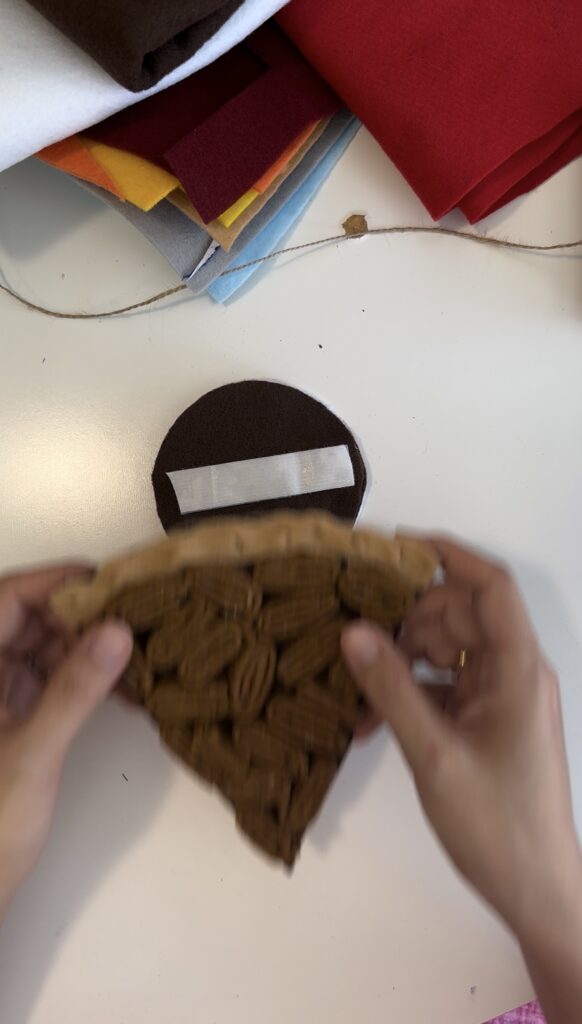 Stick a piece of **Velcro (sticky side)** to one side of the dark brown felt base — this will be your “pie side.” To ensure perfect placement, attach the matching Velcro piece to it first, then press your felt pie onto the sticky backing. Now your **pie side** is complete.