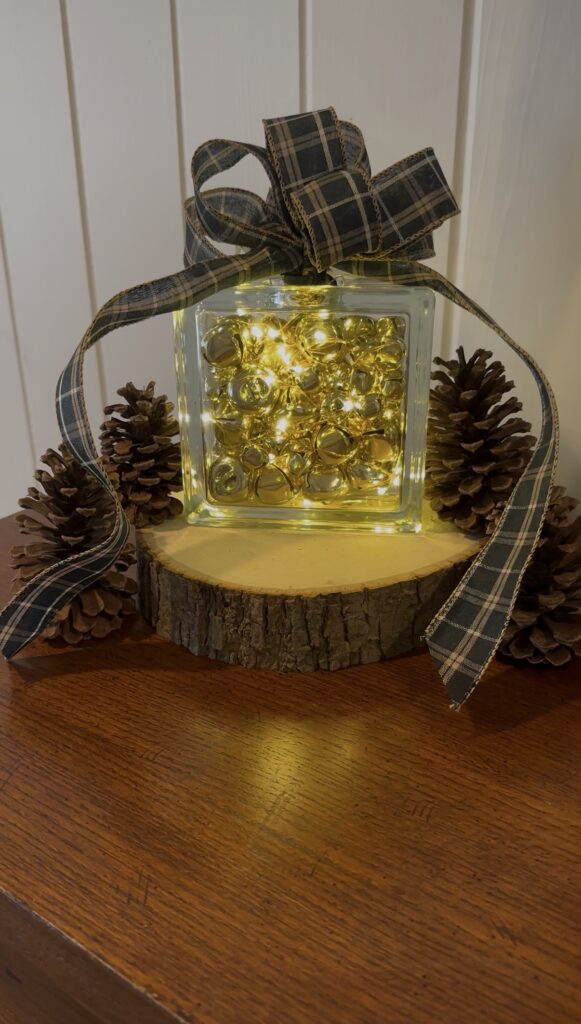 – Fill the glass box with bells in mixed sizes or all small bells. As you add the bells, wrap or tuck rope lights as you add the bells to add subtle glow.