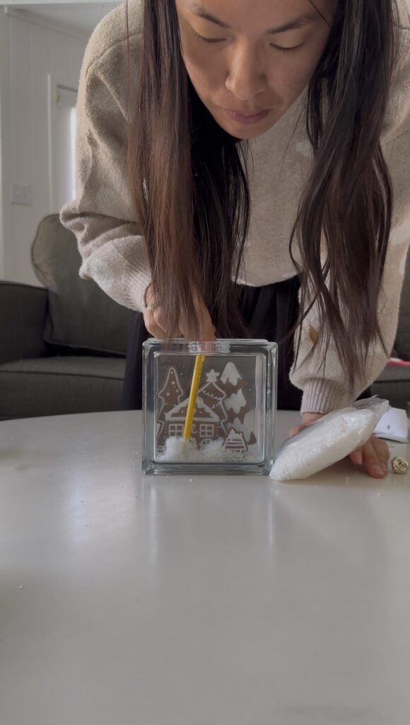 – Place the tabbed piece inside the box. The faux snow hides the anchor entirely!
